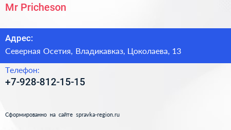 Mr.Pricheson по адресу Северная Осетия, Владикавказ, Цоколаева, 13 в дальнейшем Организация, размещена в следующих категориях: