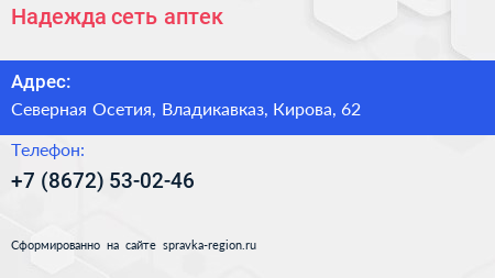 Надежда, сеть аптек по адресу Северная Осетия, Владикавказ, Кирова, 62 в дальнейшем Организация, размещена в следующих категориях: