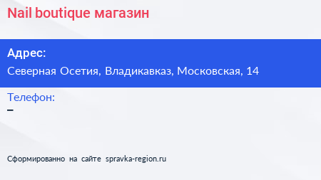 Nail boutique, магазин по адресу Северная Осетия, Владикавказ, Московская, 14 в дальнейшем Организация, размещена в следующих категориях:
