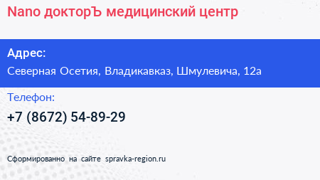 Nano докторЪ, медицинский центр по адресу Северная Осетия, Владикавказ, Шмулевича, 12а в дальнейшем Организация, размещена в следующих категориях: