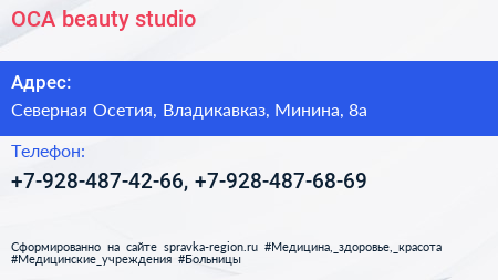 OCA beauty studio по адресу Северная Осетия, Владикавказ, Минина, 8а в дальнейшем Организация, размещена в следующих категориях: