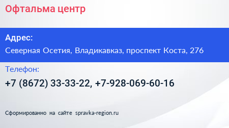 Офтальма, центр по адресу Северная Осетия, Владикавказ, проспект Коста, 276 в дальнейшем Организация, размещена в следующих категориях:
