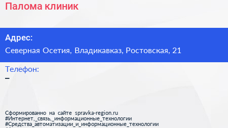 Палома клиник по адресу Северная Осетия, Владикавказ, Ростовская, 21 в дальнейшем Организация, размещена в следующих категориях: