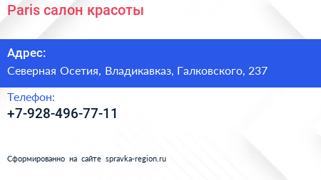 Paris, салон красоты по адресу Северная Осетия, Владикавказ, Галковского, 237 в дальнейшем Организация, размещена в следующих категориях:
