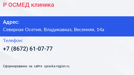 Р.ОСМЕД, клиника по адресу Северная Осетия, Владикавказ, Весенняя, 14а в дальнейшем Организация, размещена в следующих категориях: