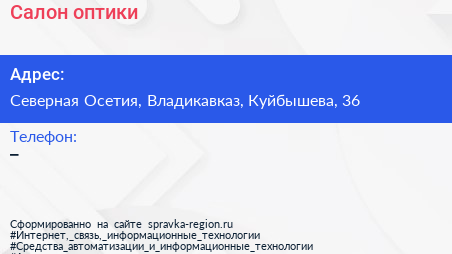 Салон оптики по адресу Северная Осетия, Владикавказ, Куйбышева, 36 в дальнейшем Организация, размещена в следующих категориях: