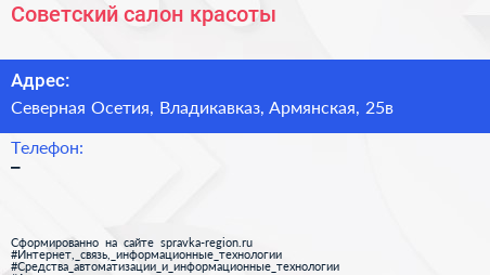 Советский, салон красоты по адресу Северная Осетия, Владикавказ, Армянская, 25в в дальнейшем Организация, размещена в следующих категориях: