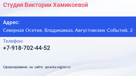 Студия Виктории Хамикоевой по адресу Северная Осетия, Владикавказ, Августовских Событий, 2 в дальнейшем Организация, размещена в следующих категориях: