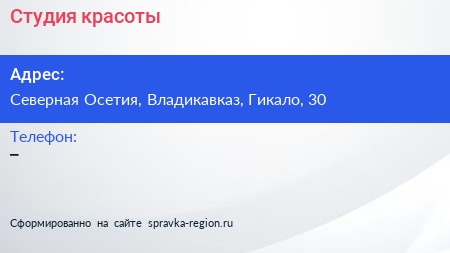 Студия красоты по адресу Северная Осетия, Владикавказ, Гикало, 30 в дальнейшем Организация, размещена в следующих категориях: