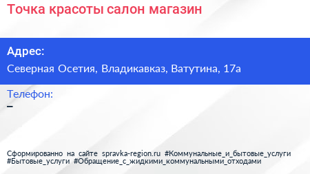 Точка красоты, салон-магазин по адресу Северная Осетия, Владикавказ, Ватутина, 17а в дальнейшем Организация, размещена в следующих категориях: