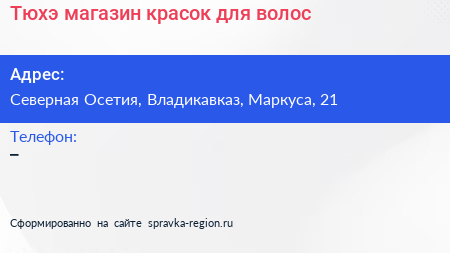 Тюхэ, магазин красок для волос по адресу Северная Осетия, Владикавказ, Маркуса, 21 в дальнейшем Организация, размещена в следующих категориях: