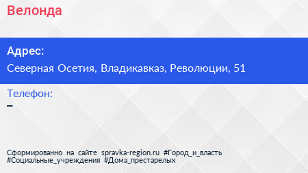 Велонда по адресу Северная Осетия, Владикавказ, Революции, 51 в дальнейшем Организация, размещена в следующих категориях:
