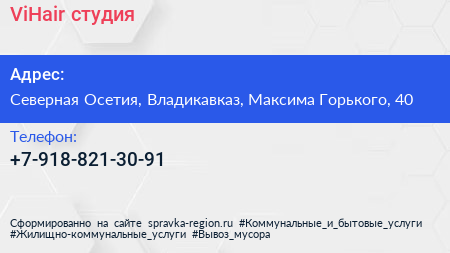 ViHair, студия по адресу Северная Осетия, Владикавказ, Максима Горького, 40 в дальнейшем Организация, размещена в следующих категориях: