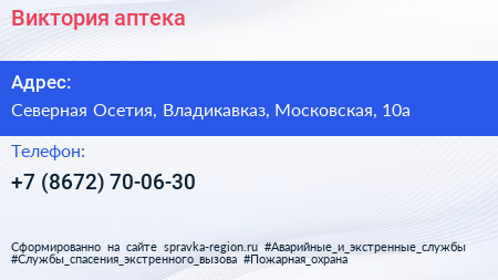 Виктория, аптека по адресу Северная Осетия, Владикавказ, Московская, 10а в дальнейшем Организация, размещена в следующих категориях: