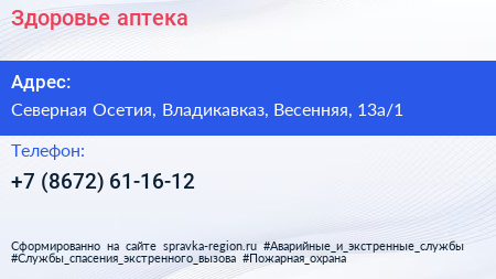 Здоровье, аптека по адресу Северная Осетия, Владикавказ, Весенняя, 13а/1 в дальнейшем Организация, размещена в следующих категориях: