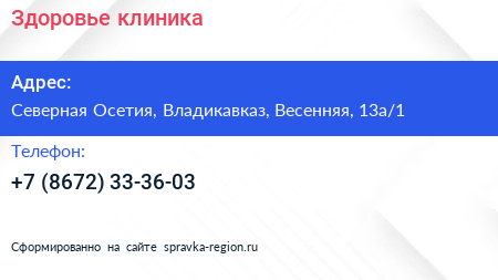 Здоровье, клиника по адресу Северная Осетия, Владикавказ, Весенняя, 13а/1 в дальнейшем Организация, размещена в следующих категориях: