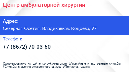 Центр амбулаторной хирургии по адресу Северная Осетия, Владикавказ, Коцоева, 97 в дальнейшем Организация, размещена в следующих категориях: