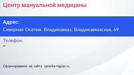 Центр мануальной медицины по адресу Северная Осетия, Владикавказ, Владикавказская, 69 в дальнейшем Организация, размещена в следующих категориях: