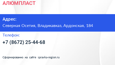 АЛЮМПЛАСТ по адресу Северная Осетия, Владикавказ, Ардонская, 184 в дальнейшем Организация, размещена в следующих категориях: