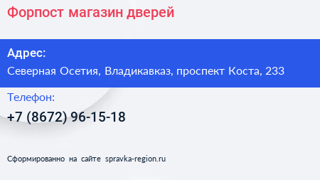 Форпост, магазин дверей по адресу Северная Осетия, Владикавказ, проспект Коста, 233 в дальнейшем Организация, размещена в следующих категориях: