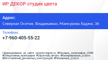 ИР-ДЕКОР, студия цвета по адресу Северная Осетия, Владикавказ, Мамсурова Хаджи, 36 в дальнейшем Организация, размещена в следующих категориях: