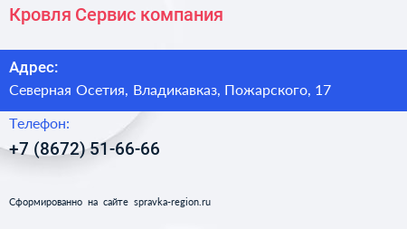 Кровля Сервис, компания по адресу Северная Осетия, Владикавказ, Пожарского, 17 в дальнейшем Организация, размещена в следующих категориях: