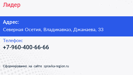 Лидер+ по адресу Северная Осетия, Владикавказ, Джанаева, 33 в дальнейшем Организация, размещена в следующих категориях: