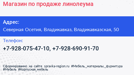 Магазин по продаже линолеума по адресу Северная Осетия, Владикавказ, Владикавказская, 50 в дальнейшем Организация, размещена в следующих категориях: