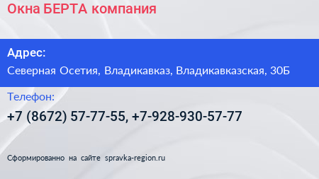 Окна БЕРТА, компания по адресу Северная Осетия, Владикавказ, Владикавказская, 30Б в дальнейшем Организация, размещена в следующих категориях: