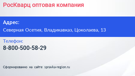 РосКварц, оптовая компания по адресу Северная Осетия, Владикавказ, Цоколаева, 13 в дальнейшем Организация, размещена в следующих категориях: