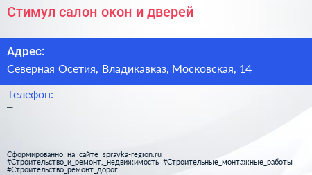 Стимул, салон окон и дверей по адресу Северная Осетия, Владикавказ, Московская, 14 в дальнейшем Организация, размещена в следующих категориях: