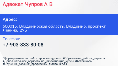 Адвокат Чупров А.В. по адресу 600015, Владимирская область, Владимир, проспект Ленина, 29Б в дальнейшем Организация, размещена в следующих категориях: