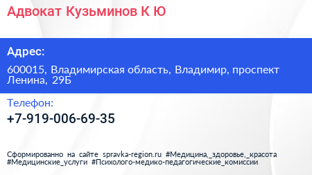 Адвокат Кузьминов К.Ю. по адресу 600015, Владимирская область, Владимир, проспект Ленина, 29Б в дальнейшем Организация, размещена в следующих категориях: