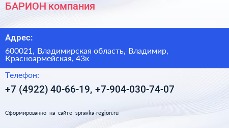 БАРИОН, компания по адресу 600021, Владимирская область, Владимир, Красноармейская, 43к в дальнейшем Организация, размещена в следующих категориях: