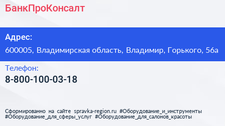 БанкПроКонсалт по адресу 600005, Владимирская область, Владимир, Горького, 56а в дальнейшем Организация, размещена в следующих категориях: