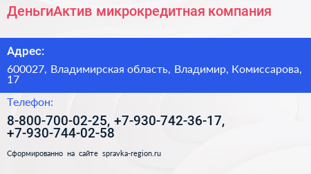 ДеньгиАктив, микрокредитная компания по адресу 600027, Владимирская область, Владимир, Комиссарова, 17 в дальнейшем Организация, размещена в следующих категориях: