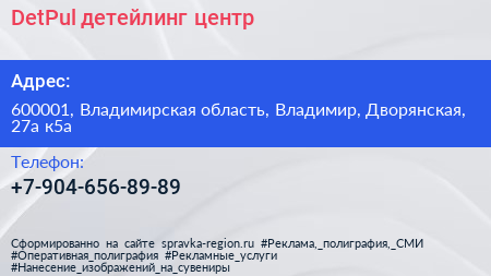 DetPul, детейлинг-центр по адресу 600001, Владимирская область, Владимир, Дворянская, 27а к5а в дальнейшем Организация, размещена в следующих категориях: