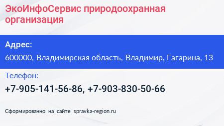 ЭкоИнфоСервис, природоохранная организация по адресу 600000, Владимирская область, Владимир, Гагарина, 13 в дальнейшем Организация, размещена в следующих категориях: