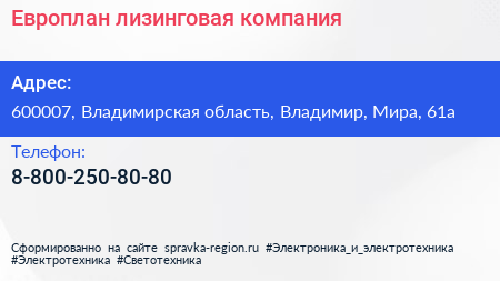 Европлан, лизинговая компания по адресу 600007, Владимирская область, Владимир, Мира, 61а в дальнейшем Организация, размещена в следующих категориях: