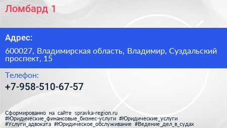 Ломбард №1 по адресу 600027, Владимирская область, Владимир, Суздальский проспект, 15 в дальнейшем Организация, размещена в следующих категориях: