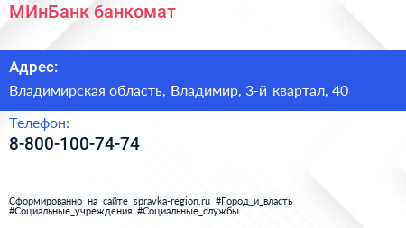 МИнБанк, банкомат по адресу Владимирская область, Владимир, 3-й квартал, 40 в дальнейшем Организация, размещена в следующих категориях: