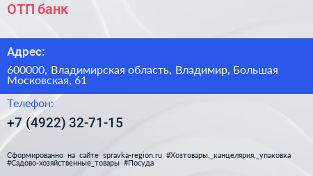 ОТП банк по адресу 600000, Владимирская область, Владимир, Большая Московская, 61 в дальнейшем Организация, размещена в следующих категориях: