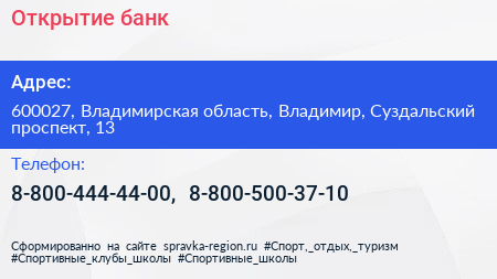 Открытие, банк по адресу 600027, Владимирская область, Владимир, Суздальский проспект, 13 в дальнейшем Организация, размещена в следующих категориях: