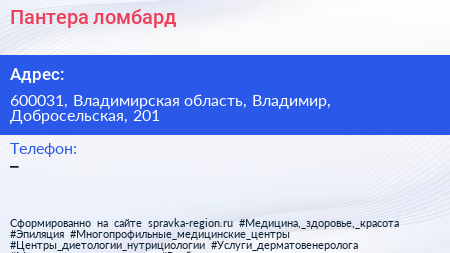 Пантера, ломбард по адресу 600031, Владимирская область, Владимир, Добросельская, 201 в дальнейшем Организация, размещена в следующих категориях: