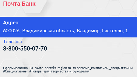 Почта Банк по адресу 600026, Владимирская область, Владимир, Гастелло, 1 в дальнейшем Организация, размещена в следующих категориях: