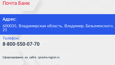 Почта Банк по адресу 600035, Владимирская область, Владимир, Безыменского, 21 в дальнейшем Организация, размещена в следующих категориях: