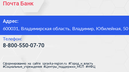 Почта Банк по адресу 600031, Владимирская область, Владимир, Юбилейная, 50 в дальнейшем Организация, размещена в следующих категориях: