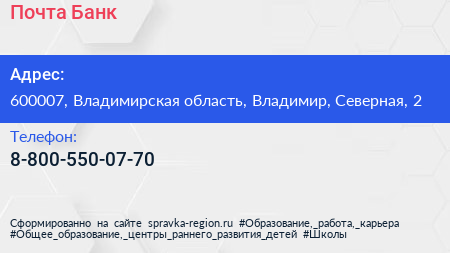 Почта Банк по адресу 600007, Владимирская область, Владимир, Северная, 2 в дальнейшем Организация, размещена в следующих категориях: