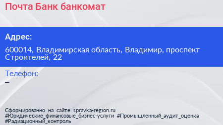 Почта Банк, банкомат по адресу 600014, Владимирская область, Владимир, проспект Строителей, 22 в дальнейшем Организация, размещена в следующих категориях: