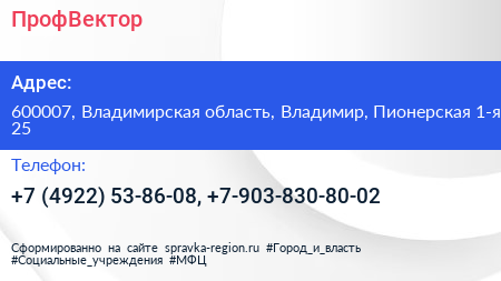 ПрофВектор по адресу 600007, Владимирская область, Владимир, Пионерская 1-я, 25 в дальнейшем Организация, размещена в следующих категориях: